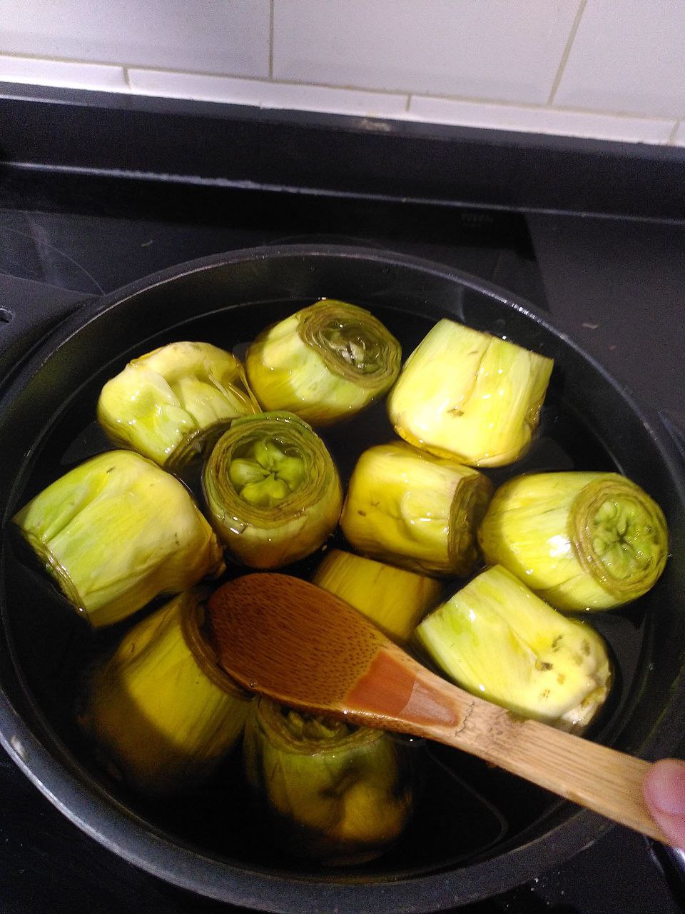 Las metemos en una olla en aceite hasta que lo cubra del todo. Yo pongo un plato encima porque las alcachofas flotan